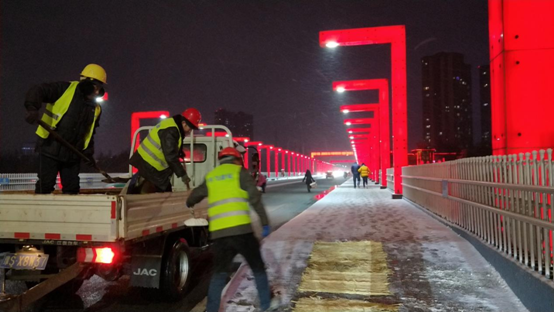2月17日傍晚7:30至凌晨1點(diǎn),申飛建工公司出動(dòng)撒布車(chē)3臺(tái),清運(yùn)車(chē)3臺(tái),鐵鍬20把,推雪鏟10把,搶險(xiǎn)隊(duì)員30余人,對(duì)申城大橋、民權(quán)大橋、新十八大街高架橋撒布融雪劑4噸,對(duì)有坡度的人行道鋪墊防滑草墊。。