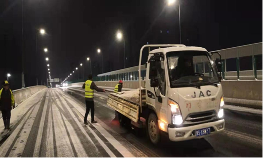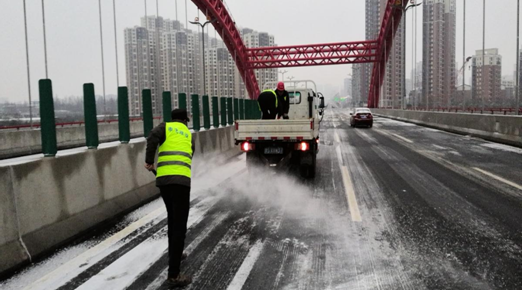 2月18日凌晨5:00至上午9:00,申飛建工搶險(xiǎn)隊(duì)再次對(duì)新十八大街高架橋巡查和撒布融雪劑2噸,確保清晨市民暢通出行。