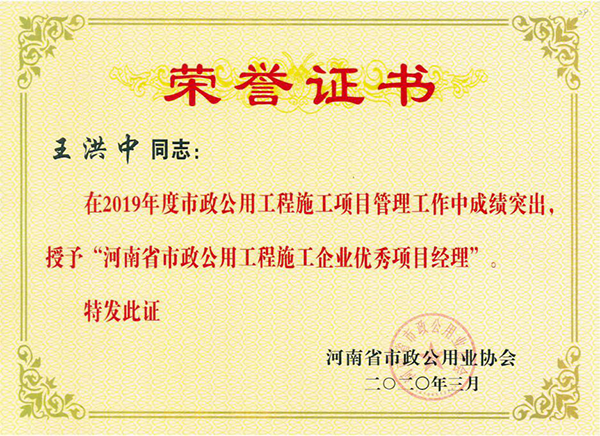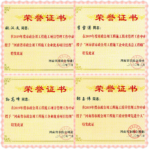 同時(shí),公司多人分別獲得“河南省市政公用工程施工企業(yè)優(yōu)秀總工程師”、“河南省市政公用工程施工企業(yè)優(yōu)秀項(xiàng)目經(jīng)理”、“河南省市政公用工程施工質(zhì)量管理先進(jìn)個(gè)人”等榮譽(yù)稱號(hào)。市政公司始終堅(jiān)持高標(biāo)準(zhǔn),嚴(yán)要求,精心管理,狠抓質(zhì)量要點(diǎn),科學(xué)施工,不論是工程硬件還是工程軟件都為此次授評(píng)奠定了堅(jiān)實(shí)的基礎(chǔ),為公司贏得了榮譽(yù)。